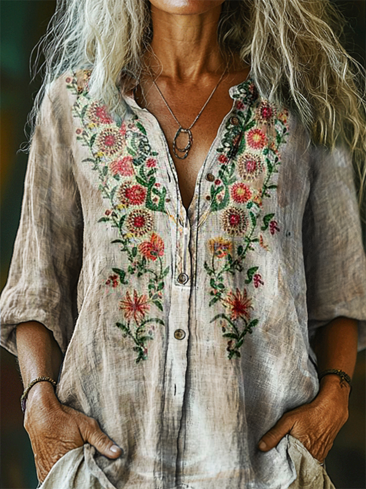 Women's Floral Pattern Art Print Casual Cotton Linen Shirt