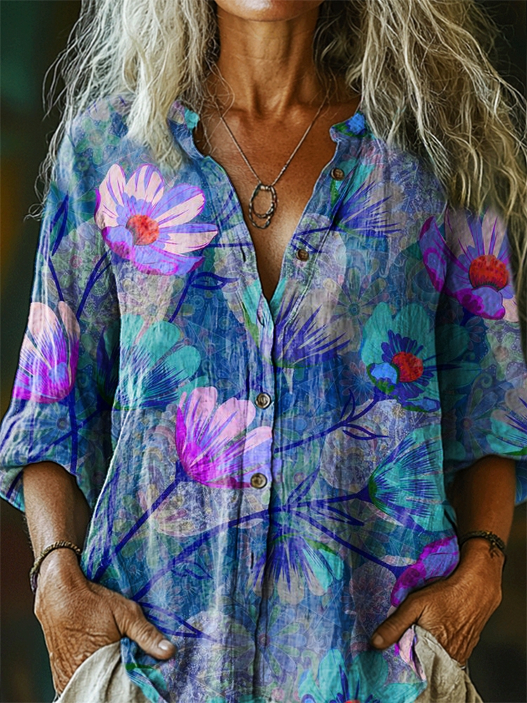 Women's Floral Pattern Art Print Casual Cotton Linen Shirt