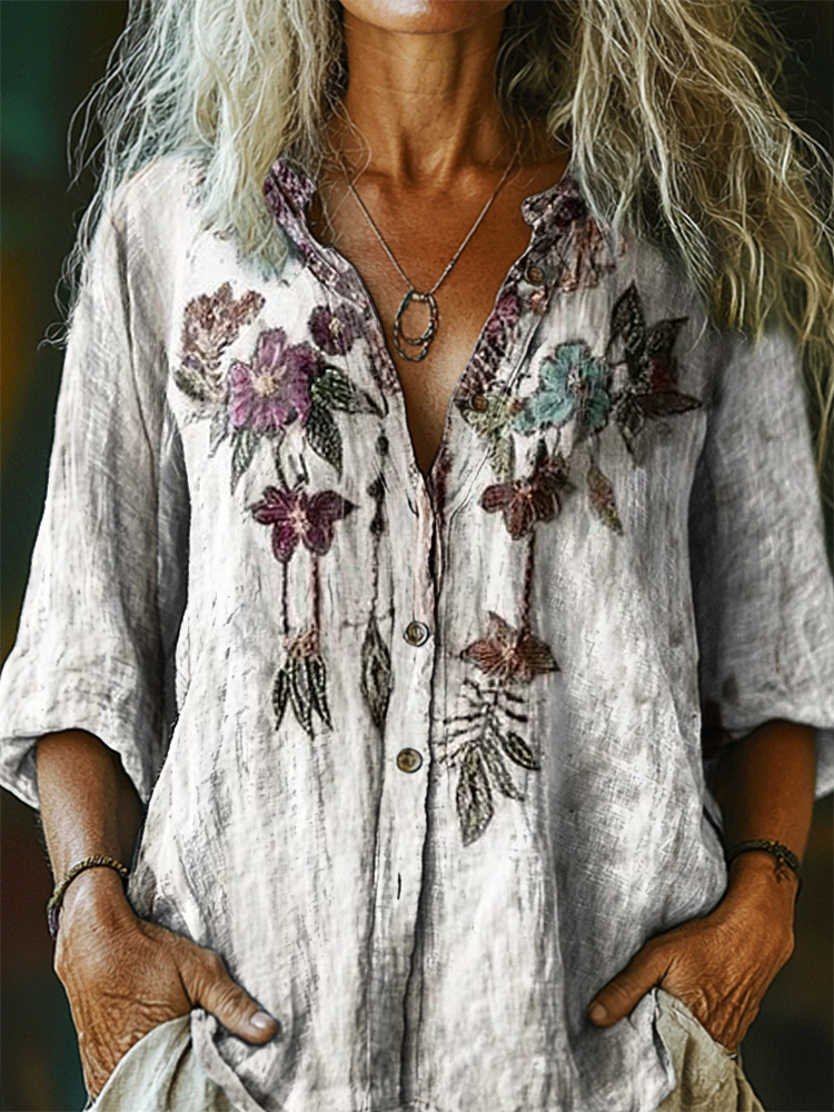 Women's Floral Pattern Art Print Casual Cotton Linen Shirt