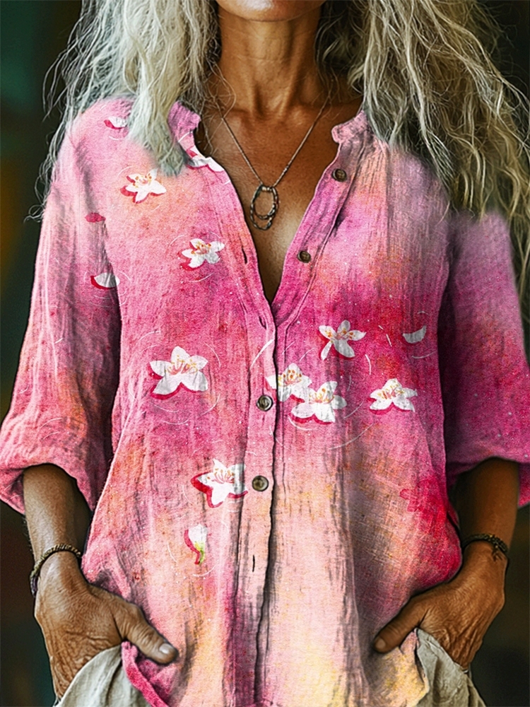 Women's Floral Pattern Art Print Casual Cotton Linen Shirt