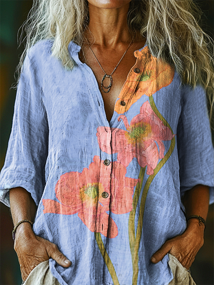 Women's Floral Pattern Art Print Casual Cotton Linen Shirt