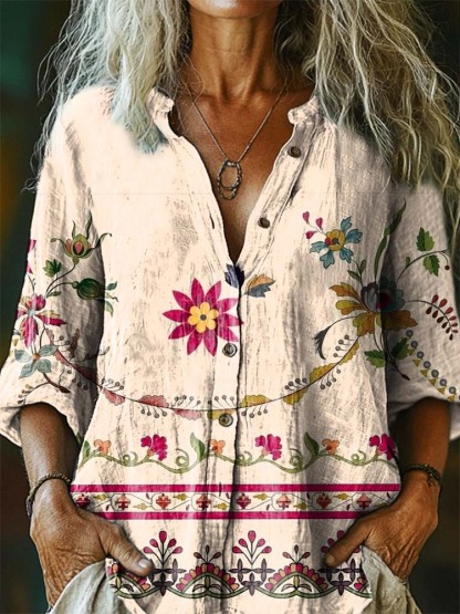 Women's Floral Pattern Art Print Casual Cotton Linen Shirt