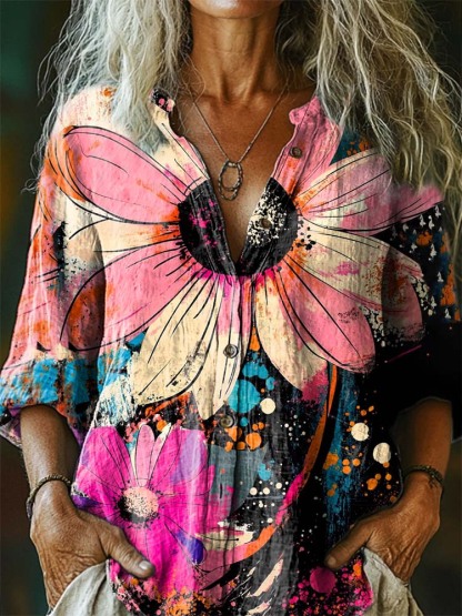Women's Floral Pattern Art Print Casual Cotton Linen Shirt