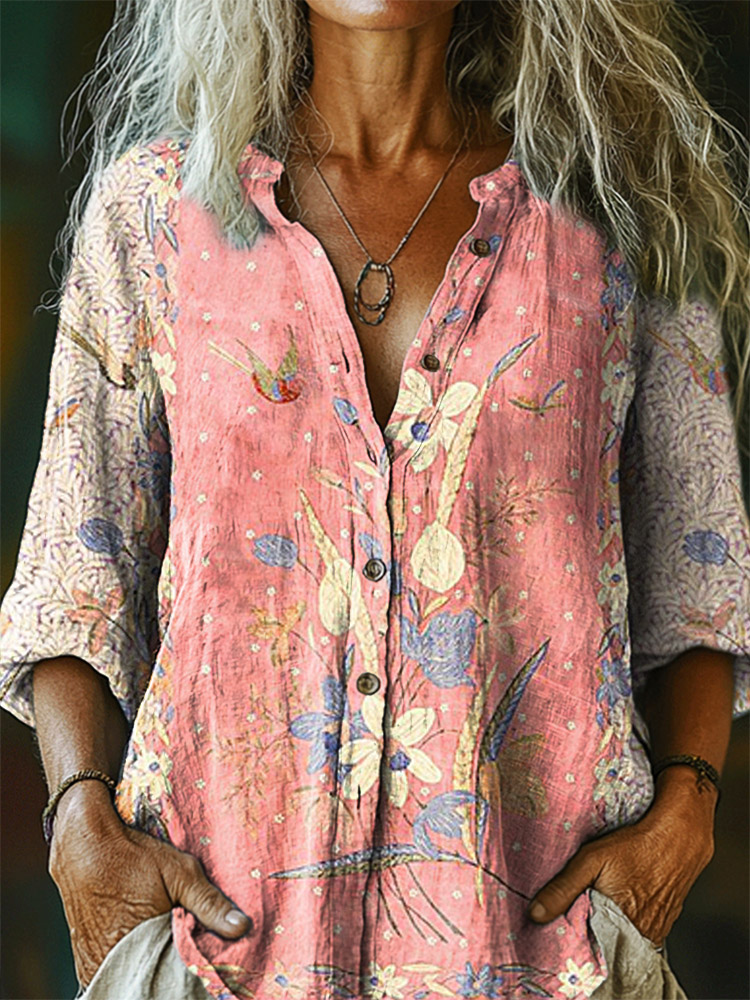 Women's Floral Pattern Art Print Casual Cotton Linen Shirt