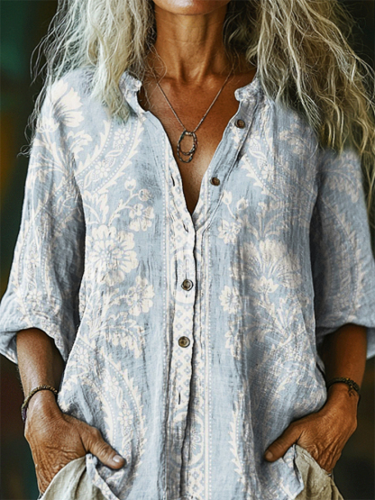 Women's Floral Tattoo Pattern Art Print Casual Cotton Linen Shirt