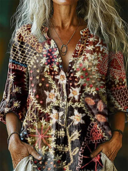 Women's Floral Tattoo Pattern Art Print Casual Cotton Linen Shirt