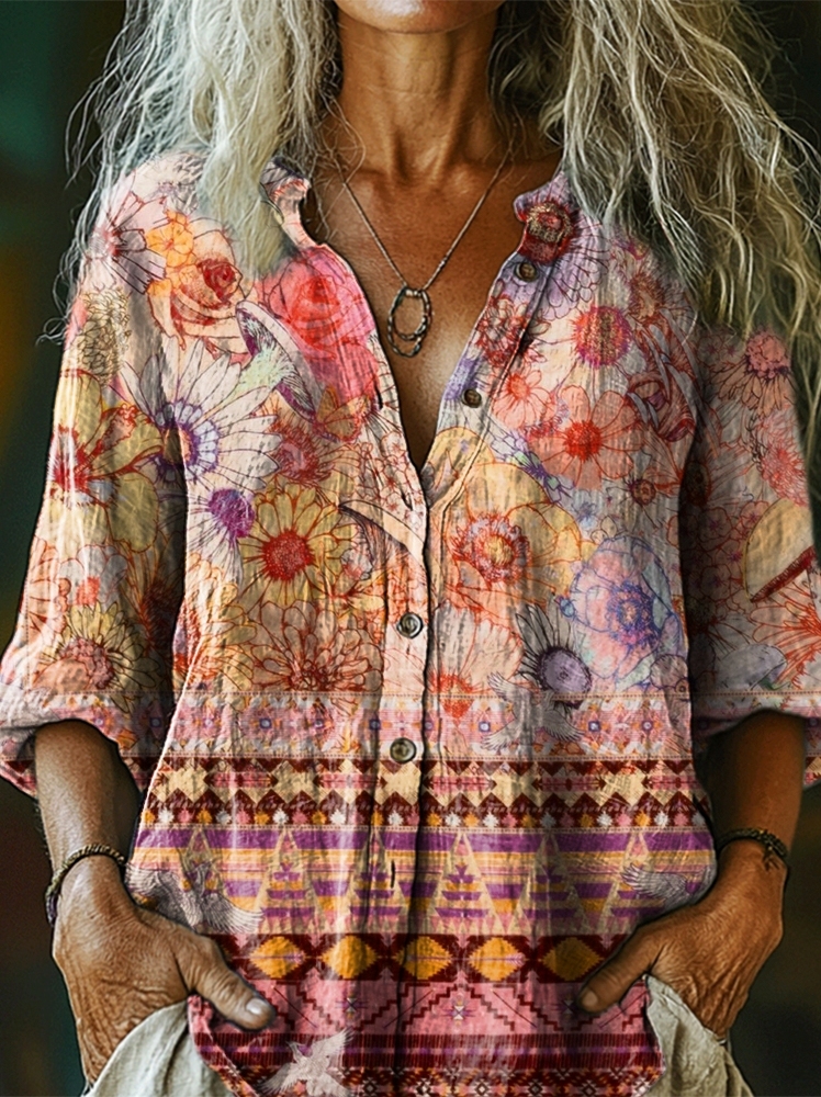 Women's Flower Art Print Casual Cotton Linen Shirt