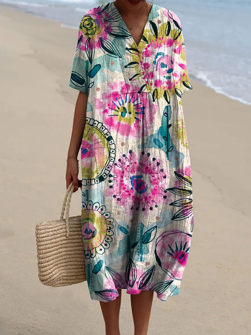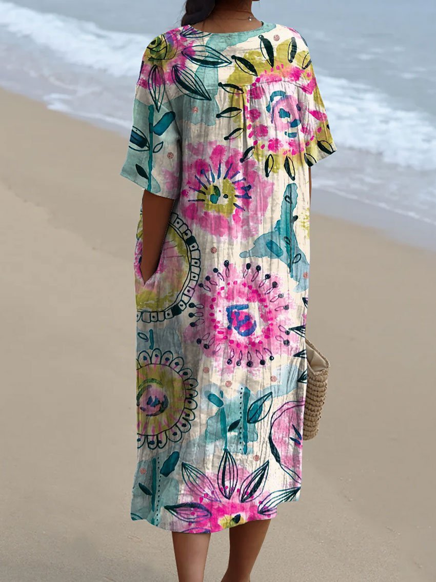 Women's Flower Watercolor Splash Fluid Art Print Flowy Dress