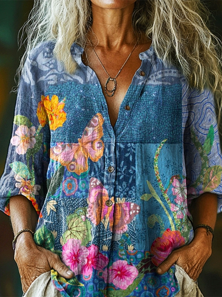 Women's Flowers Butterflies Art PatternPrint Casual Cotton Linen Shirt