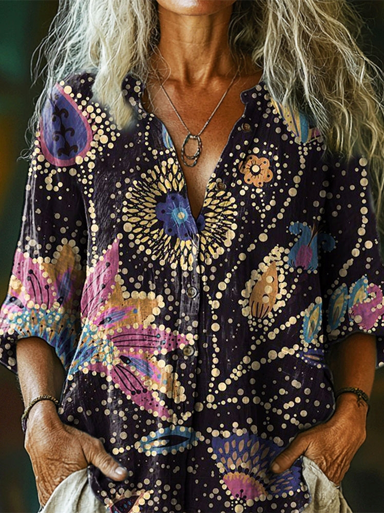 Women's Folk Art Floral Pattern Print Casual Cotton Linen Shirt