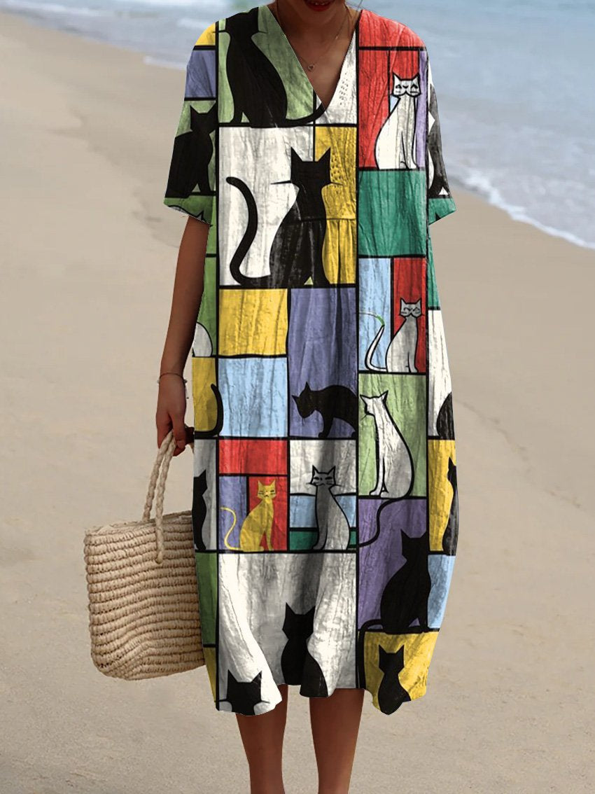 Women's Funny Cat Geometry Art Print Flowy Dress