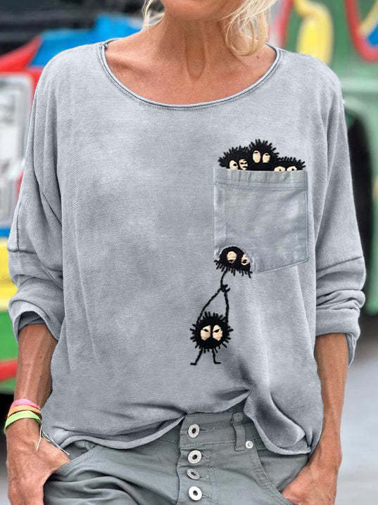Women's Funny Soot Sprites Embroidered Long Sleeve T-shirt