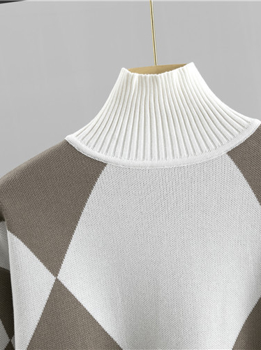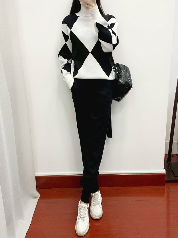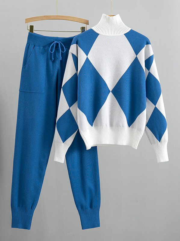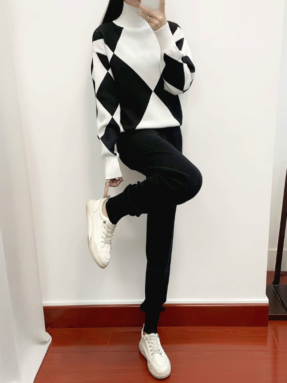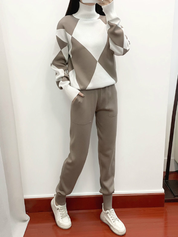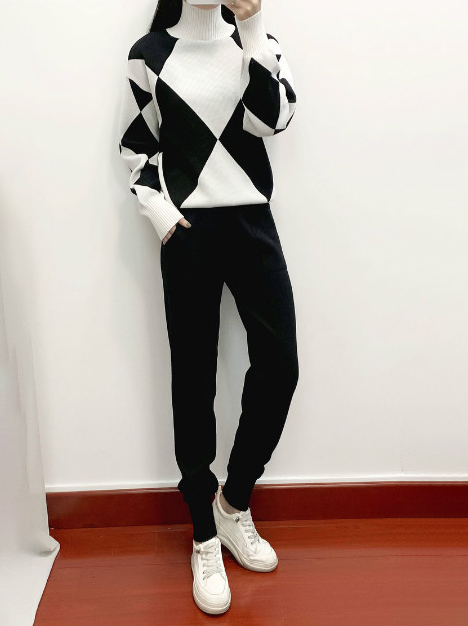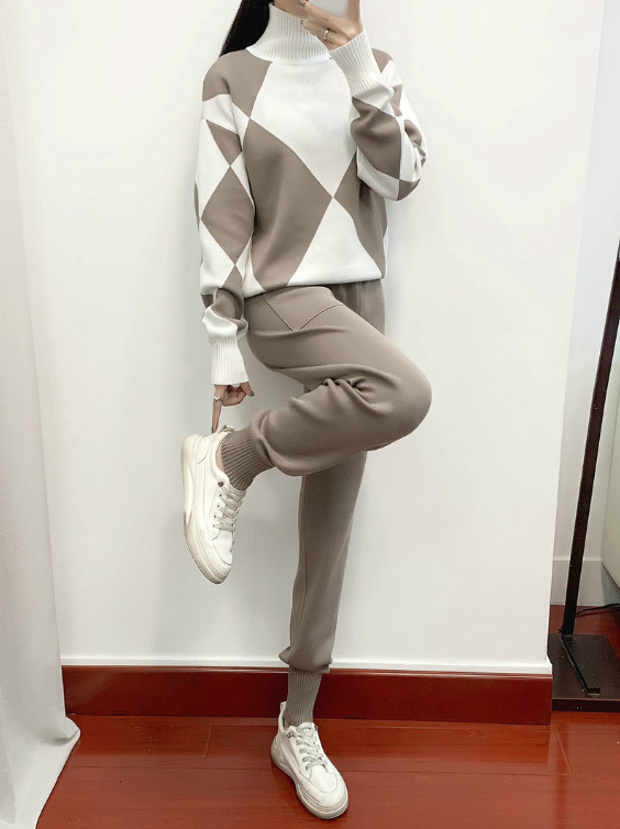 Women's Geometric Pattern High Neck Sweater Tapered Pants Matching Set
