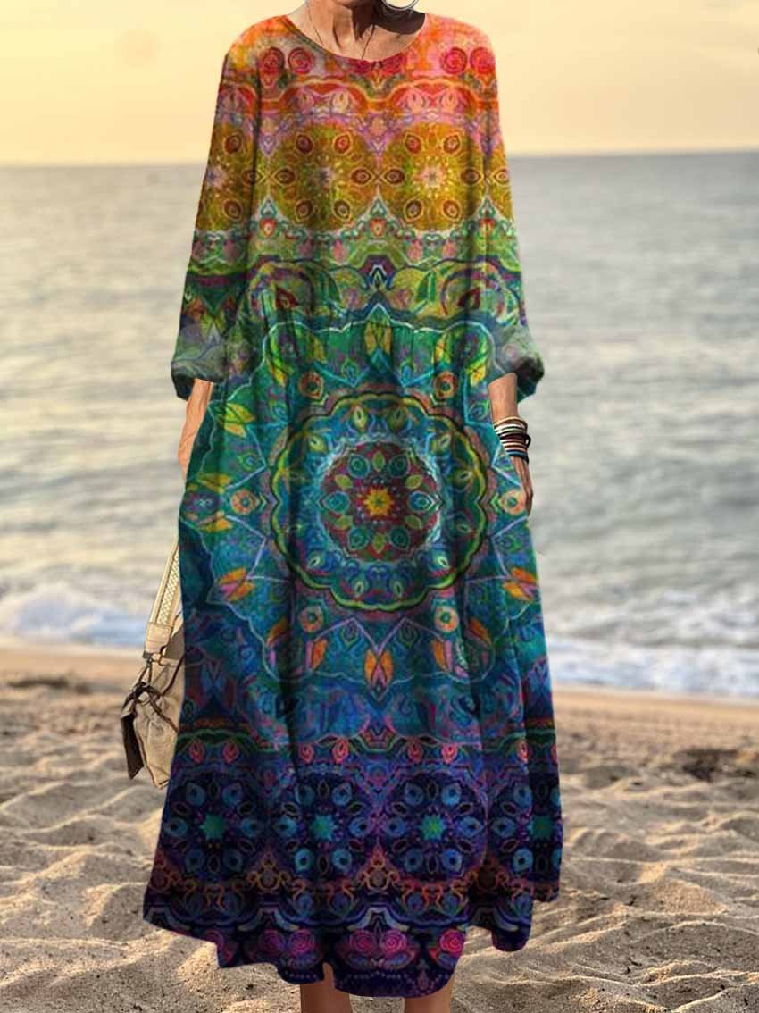Women's Gradient Color Mandala Art Print Pocket Cotton Dress