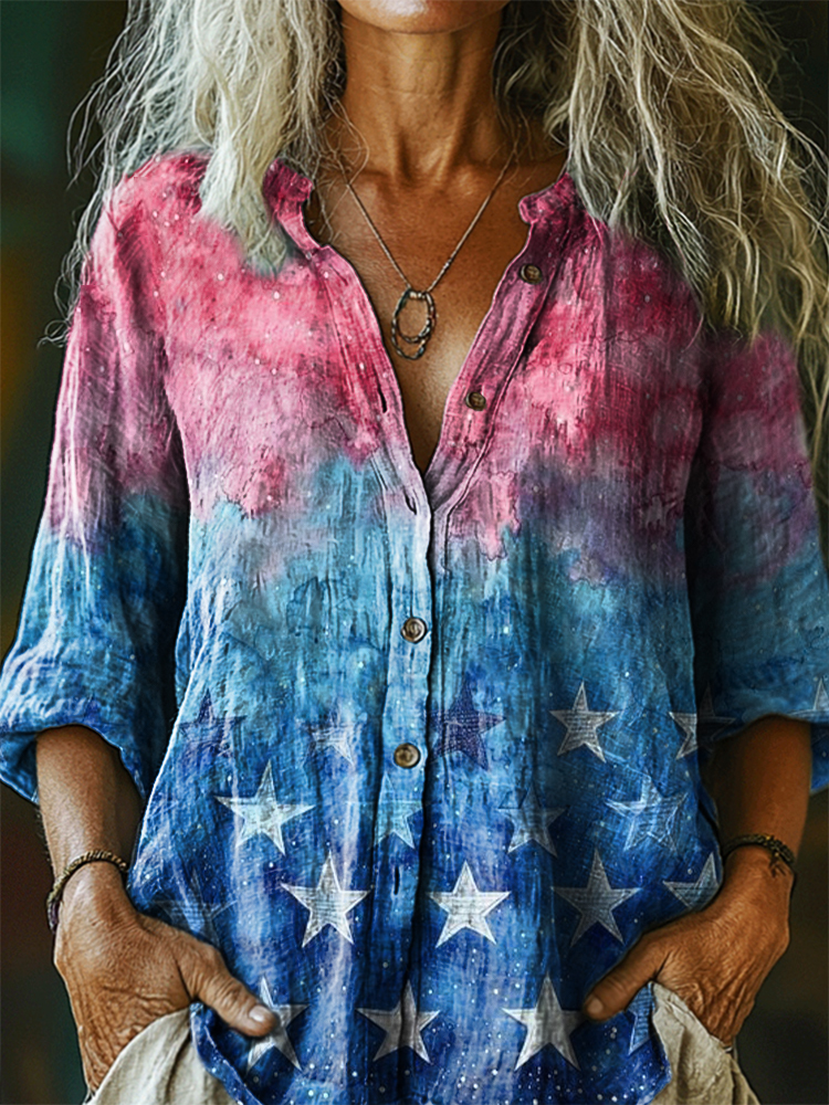 Women's Gradient Star Art Print Casual Cotton Linen Shirt