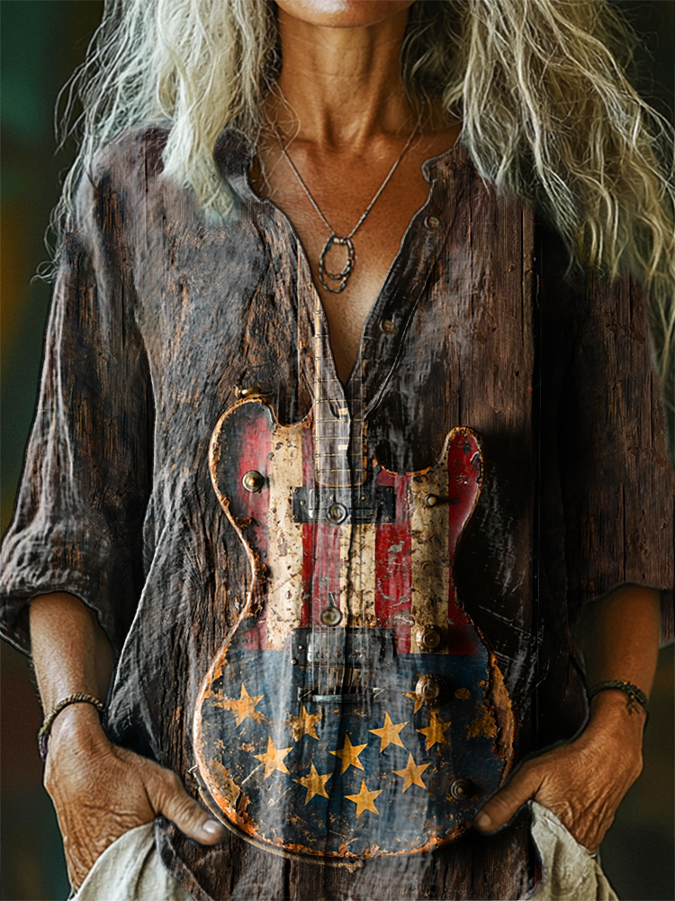 Women's Guitar Pattern Art Print Casual Cotton Linen Shirt