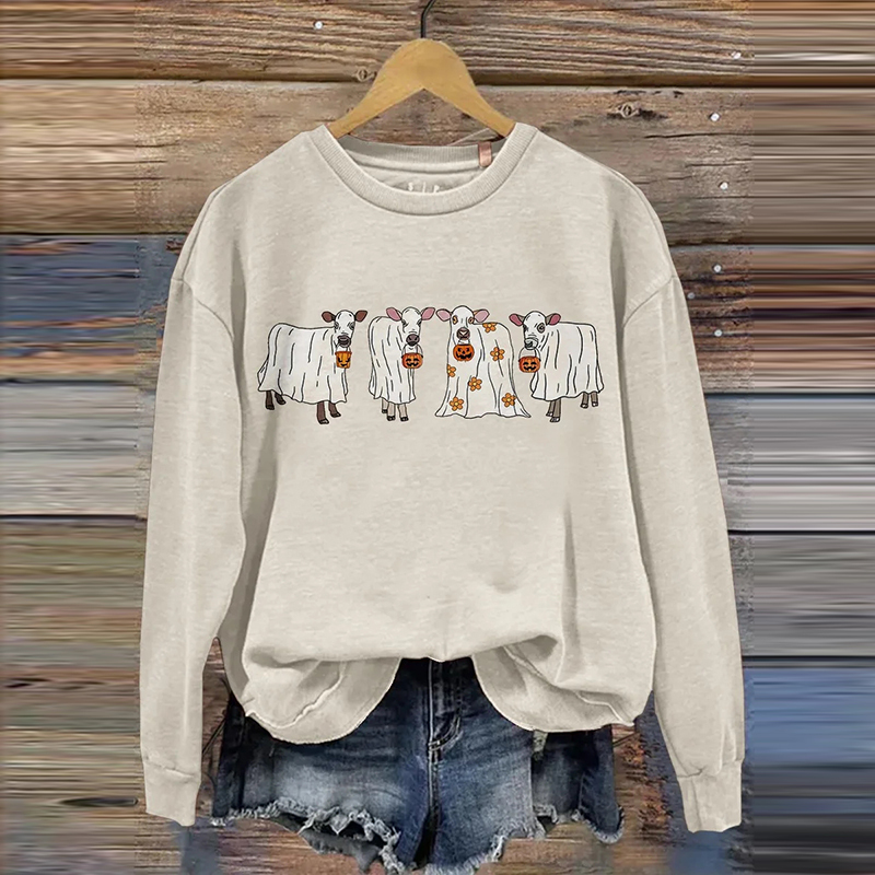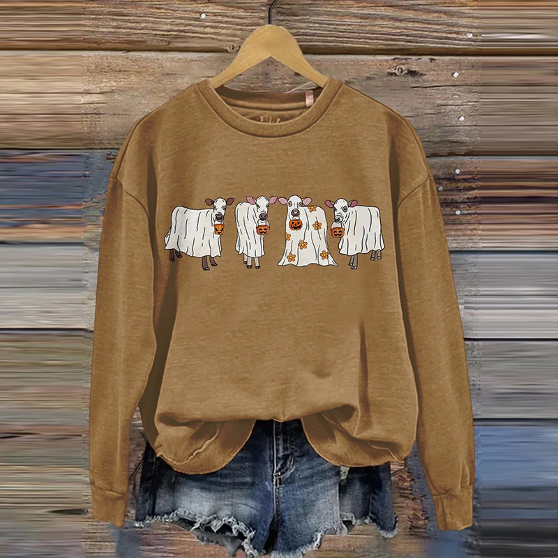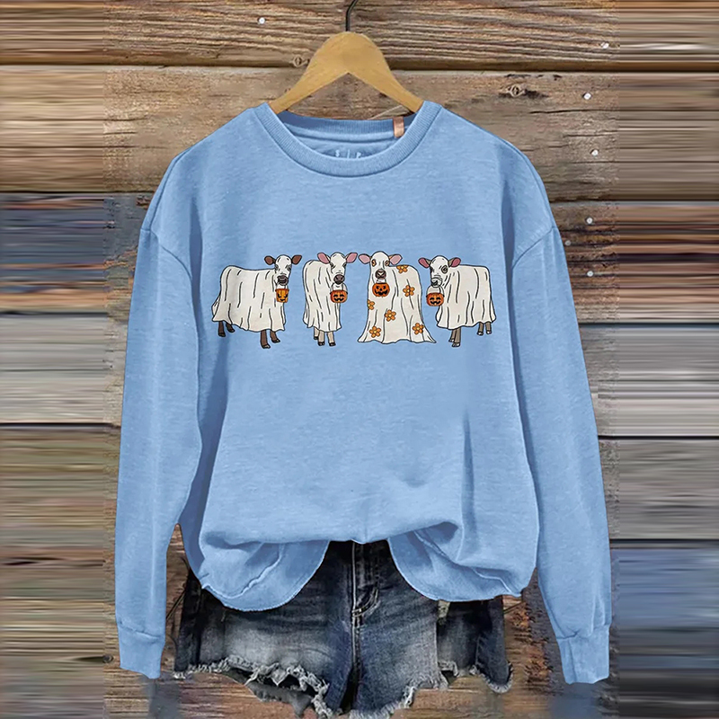 Women's Halloween Cow Ghost Print Casual Long Sleeve Sweatshirt