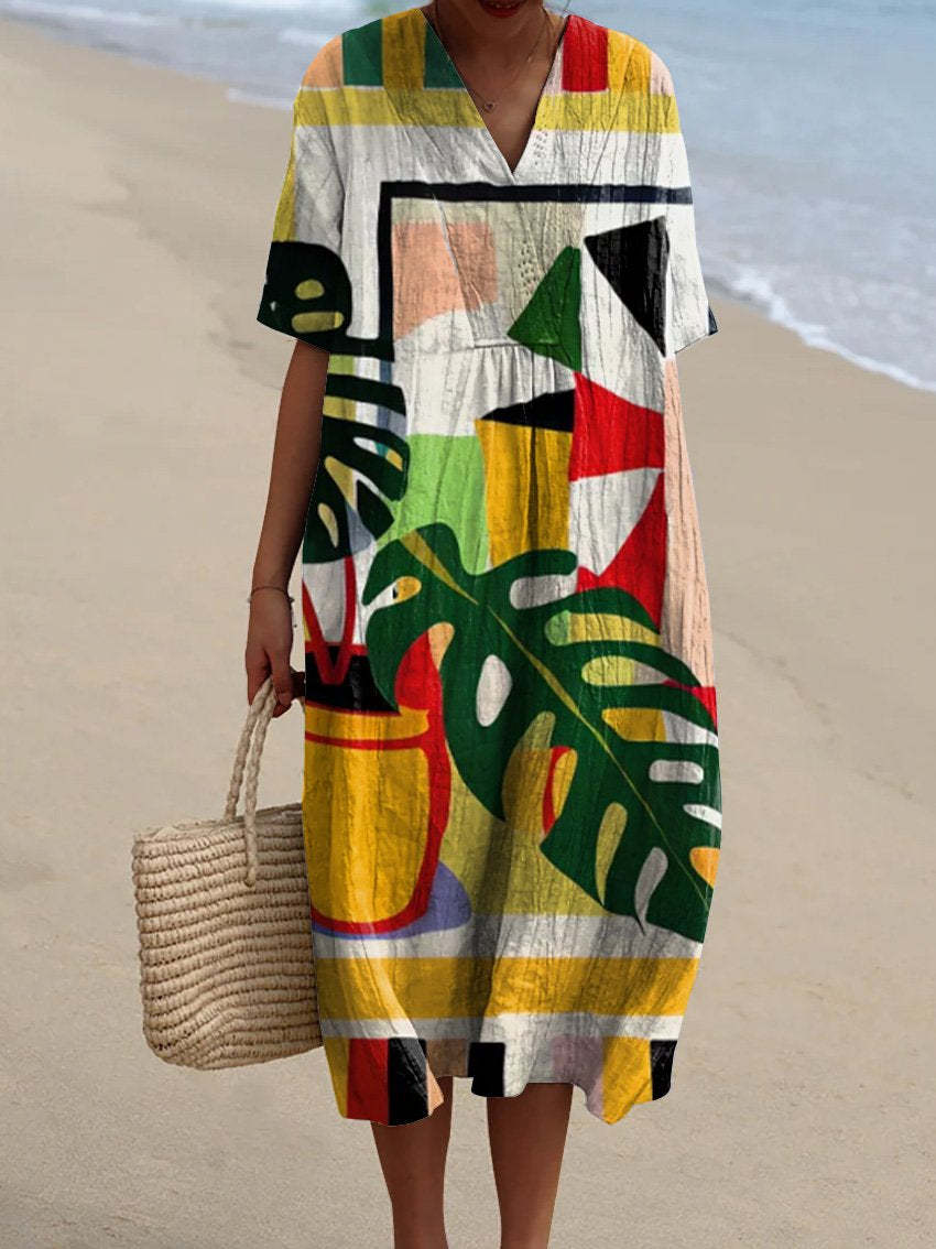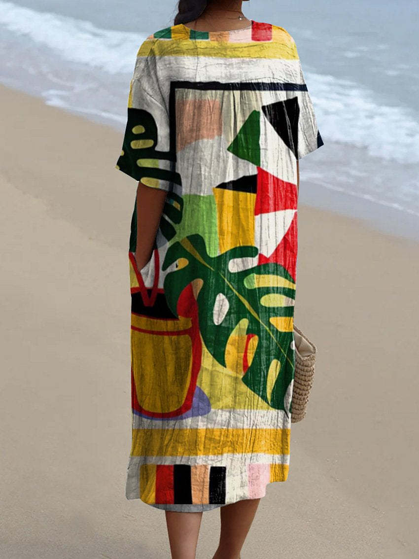 Women's Hand Drawn Colorful Geometric and Vase Print Flowing Dress