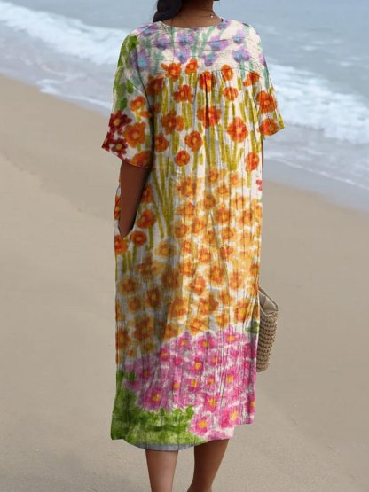 Women's Hand Painted Colorful Spring Floral Print Flowing Dress