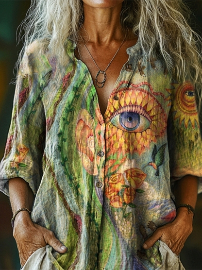 Women's Hippie Face Art Print Casual Cotton Linen Shirt