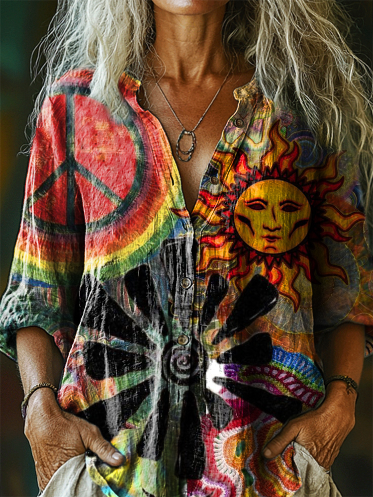 Women's Hippie Floral Art Print Casual Cotton Linen Shirt