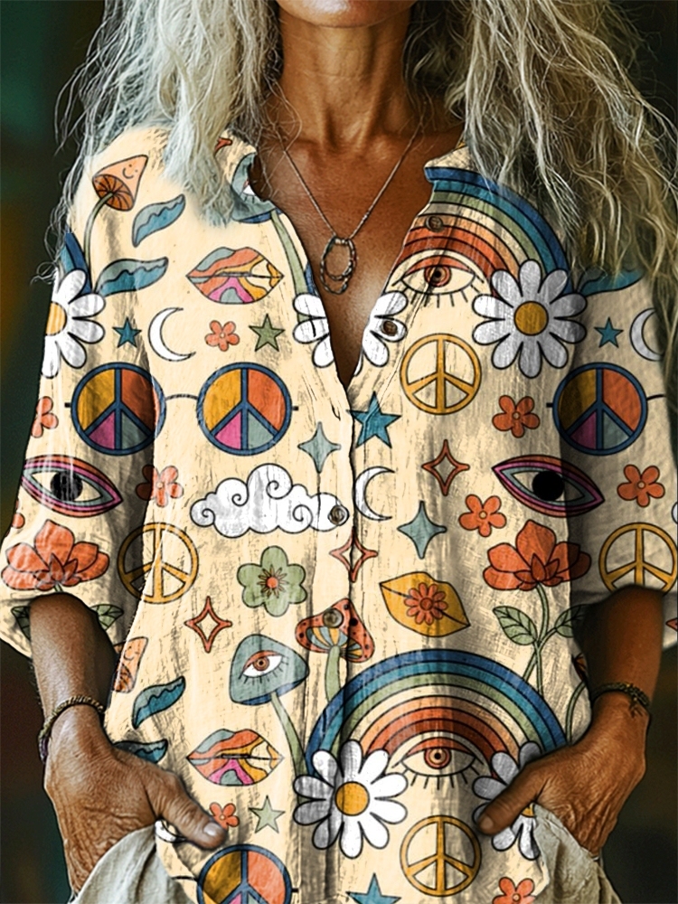 Women's Hippie Pattern Art Print Casual Cotton Linen Shirt