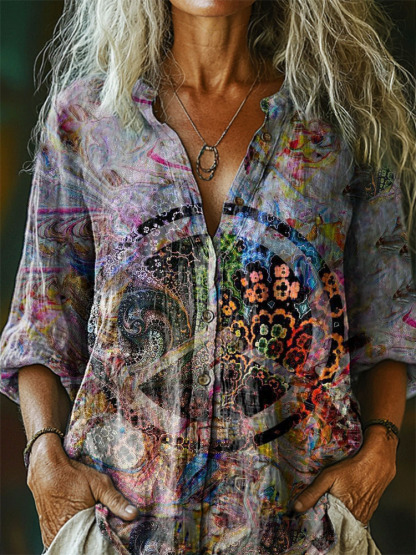 Women's Hippie Pattern Art Print Casual Cotton Linen Shirt