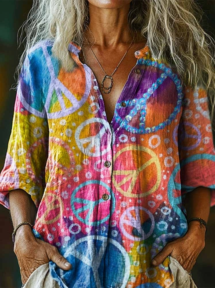 Women's Hippie Peace Gradient Art Pattern Print Casual Cotton Linen Shirt