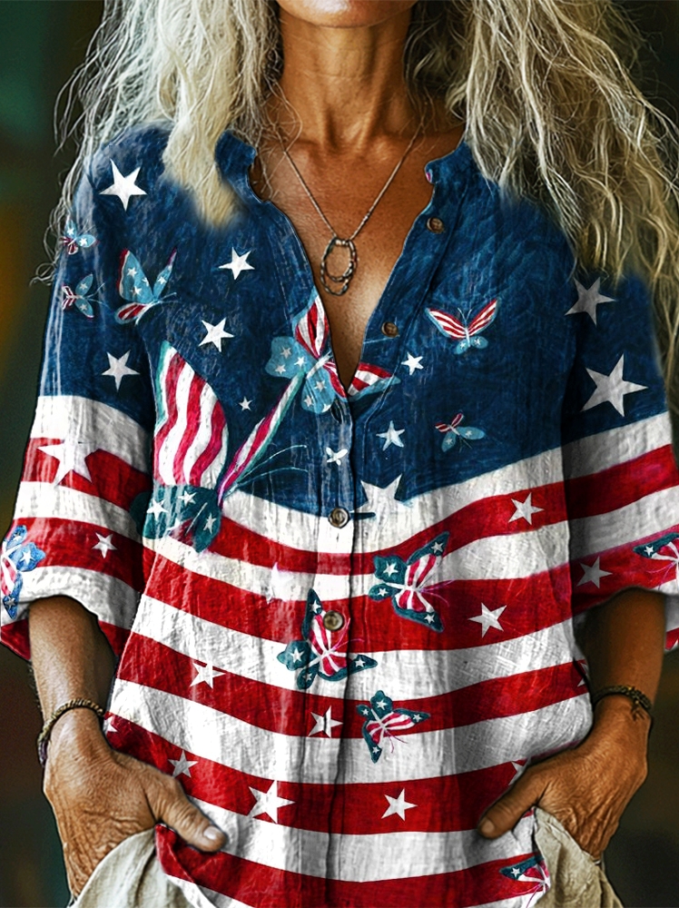 Women's Independence Day Flag Butterfly Print Casual Cotton Linen Shirt