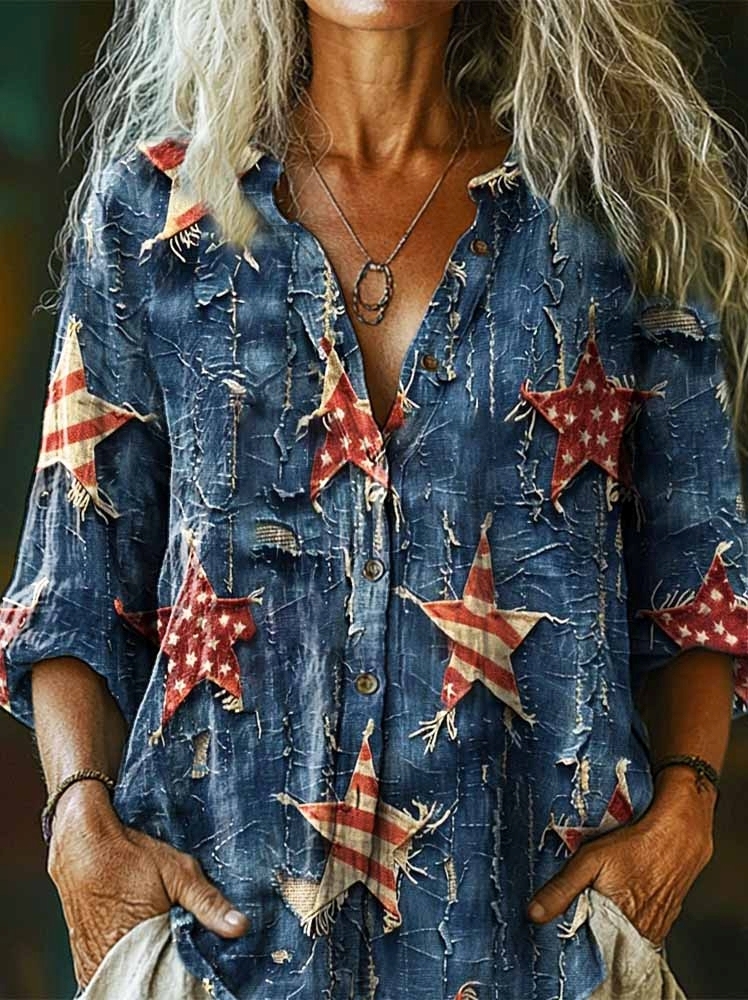 Women's Independence Day Retro Stars Patchwork Art Print Cotton and Linen Shirt