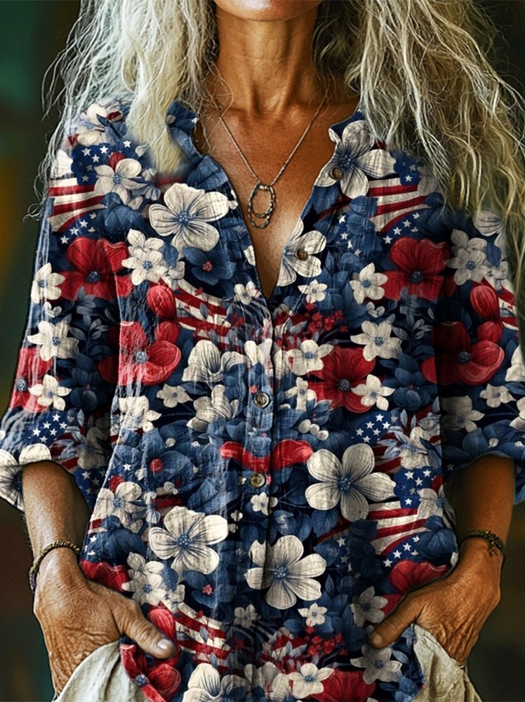 Women's Independence Day Vintage Floral Flag Art Print Casual Cotton Linen Shirt