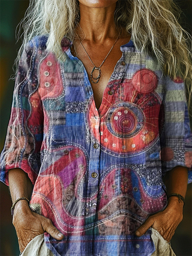 Women's Irregular Pattern Art Print Casual Cotton Linen Shirt
