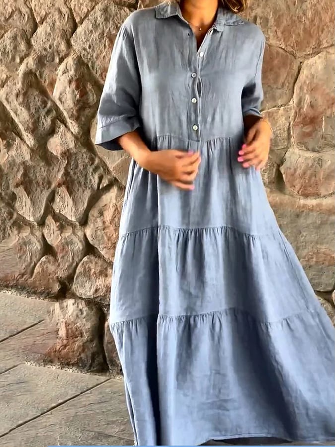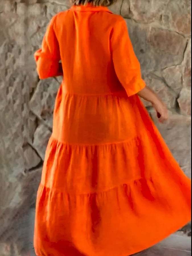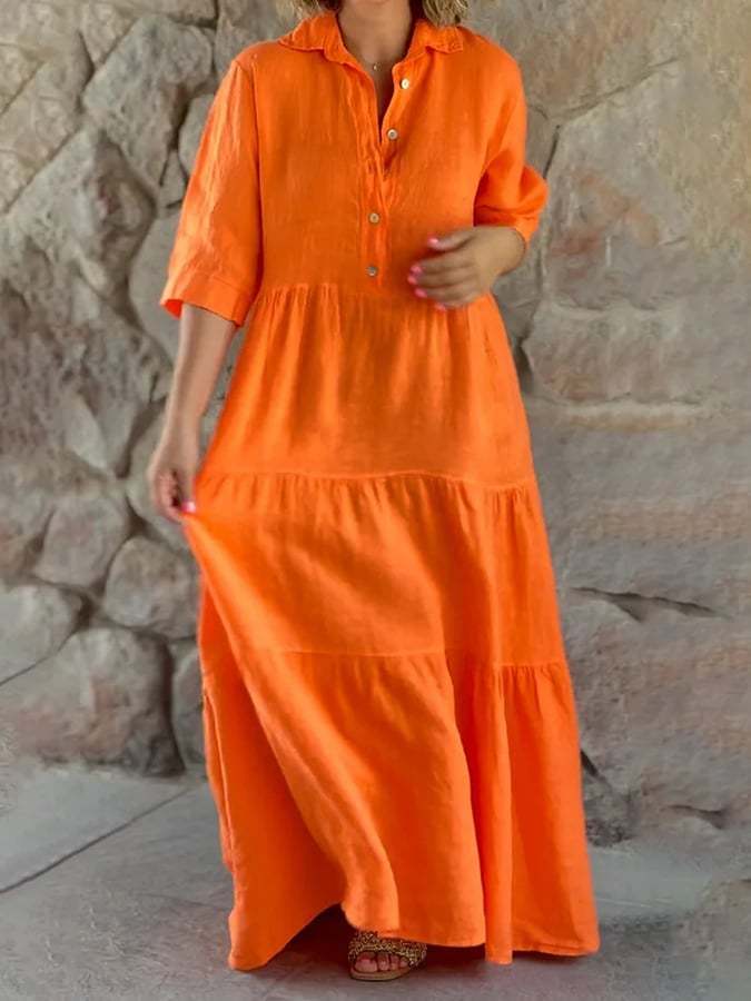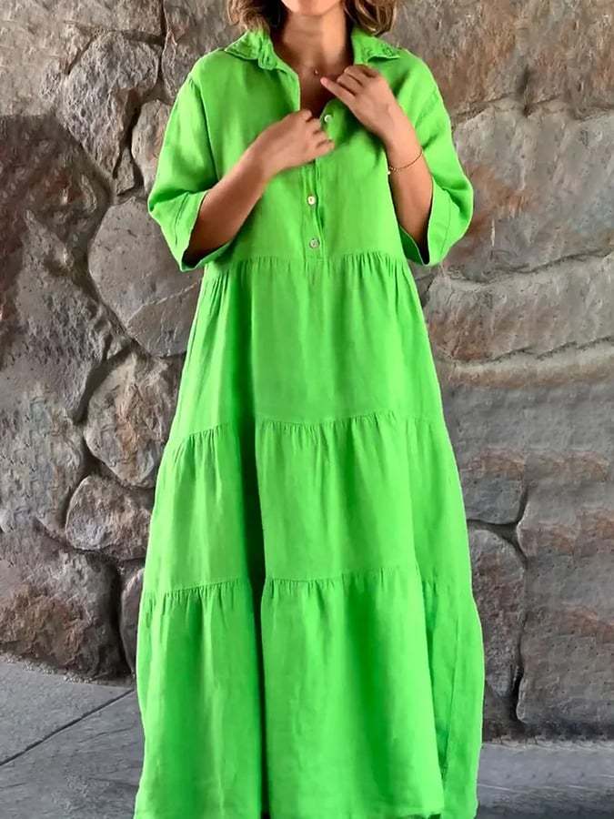 Women's Lapel Solid Color Large Hem Sleeve Casual Cotton And Linen Dress