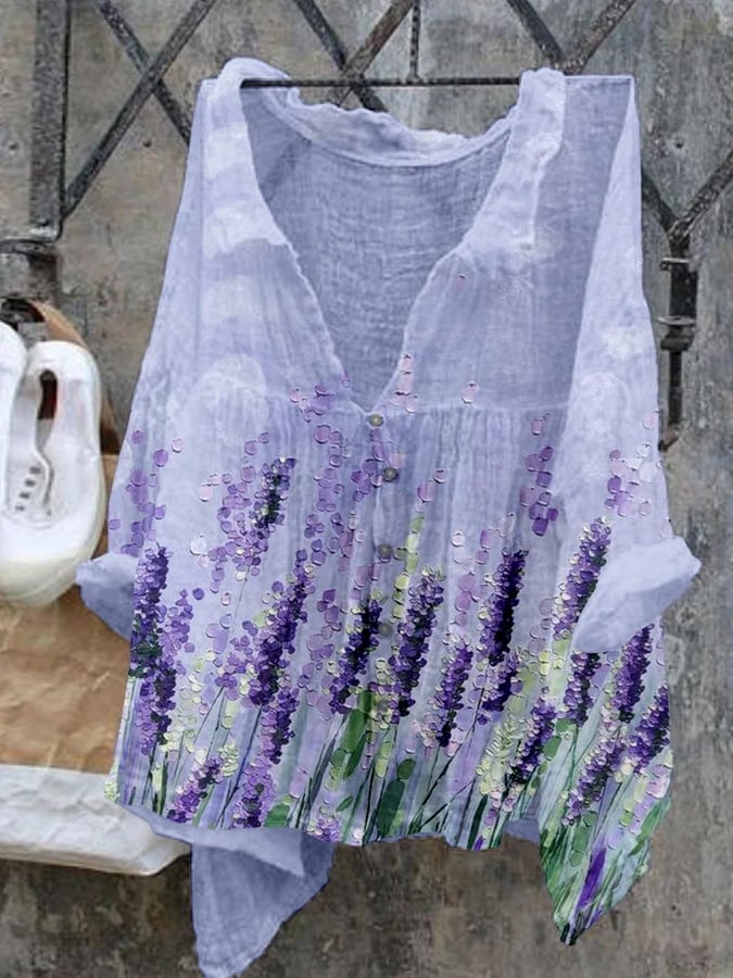 Women's Lavender Oil Painting Floral Print Casual Cotton Linen Shirt