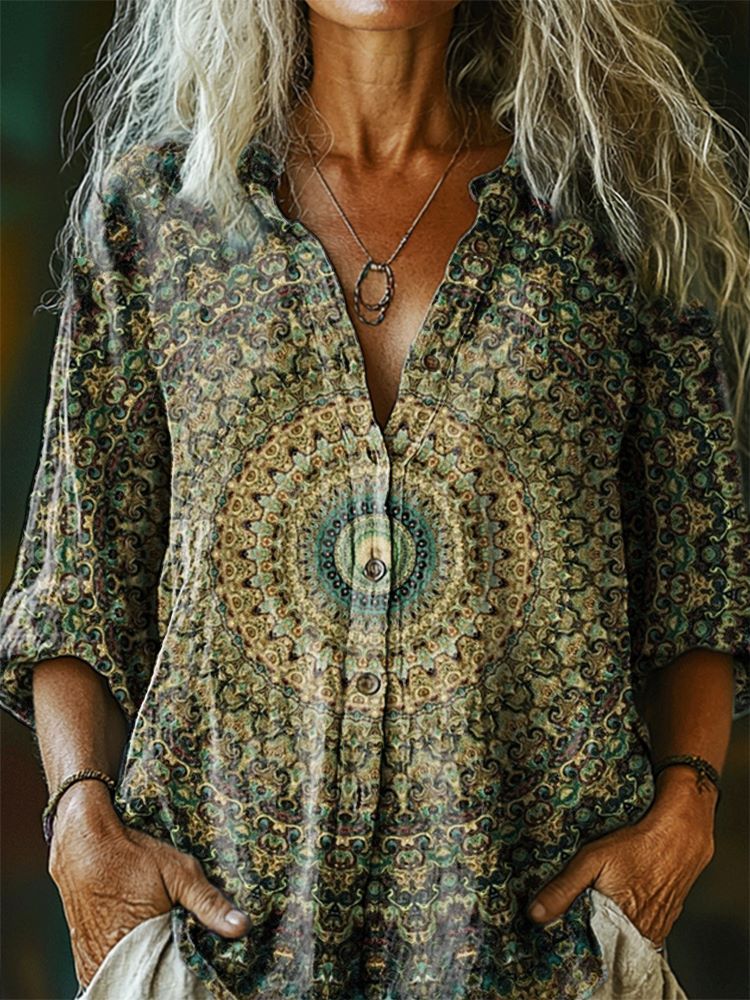 Women's Mandala Pattern Art Print Casual Cotton Linen Shirt