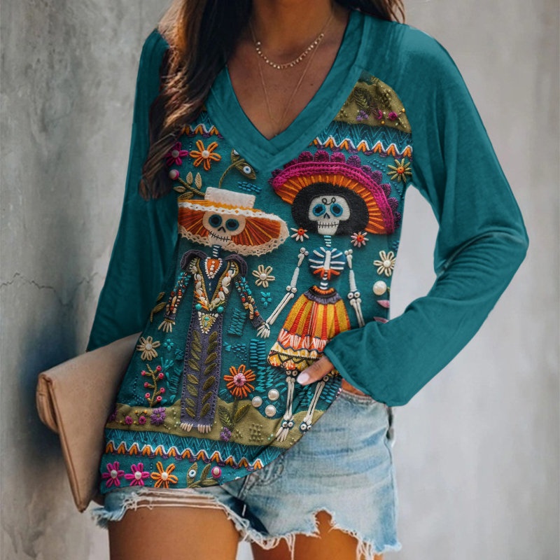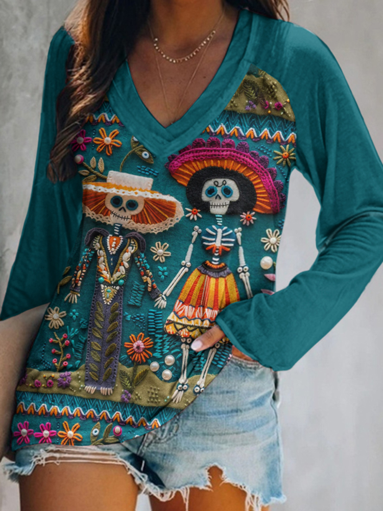 Women's Mexican Sugar Skeleton Couple Catrina Day Of The Dead Inspired Art Print Casual Long Sleeve T-Shirt
