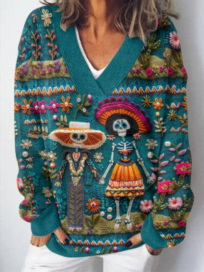 Women's Mexican Sugar Skeleton Couple Catrina Day Of The Dead Inspired Art Printed Light Sweater