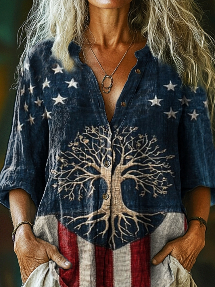 Women's National Tree of Life Flag Art Print Casual Cotton Linen Shirt
