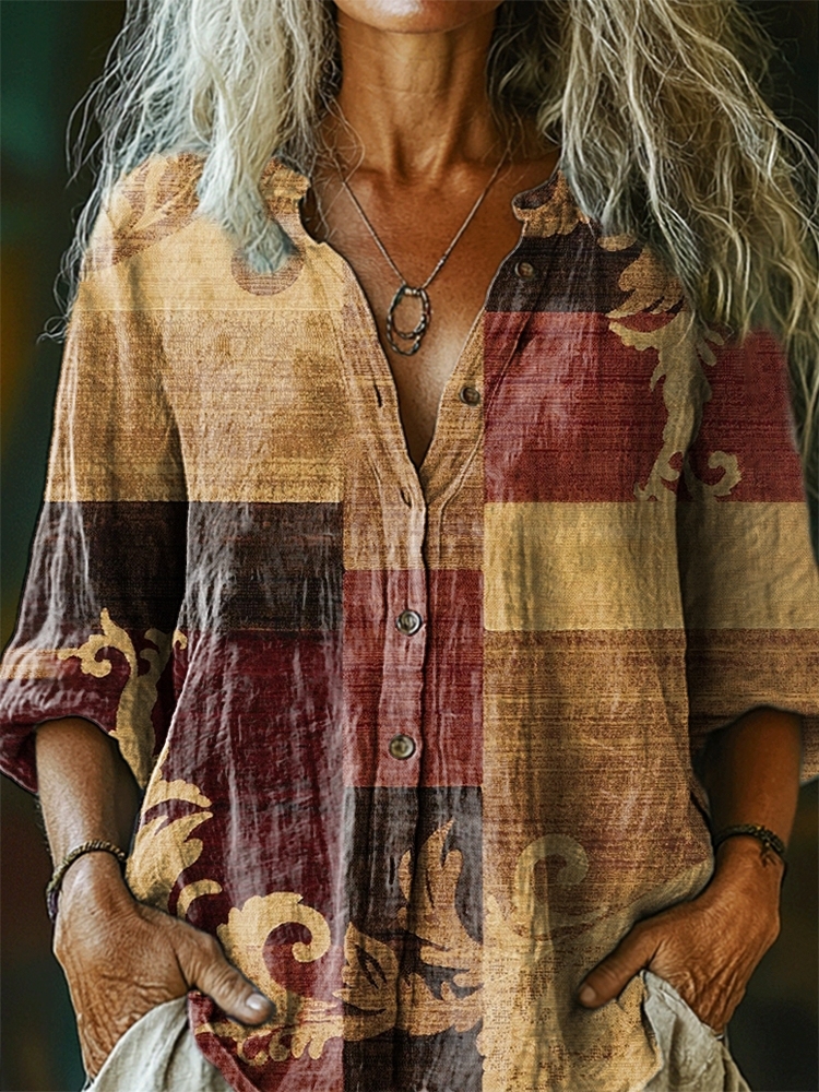 Women's Patchwork Pattern Art Print Casual Cotton Linen Shirt