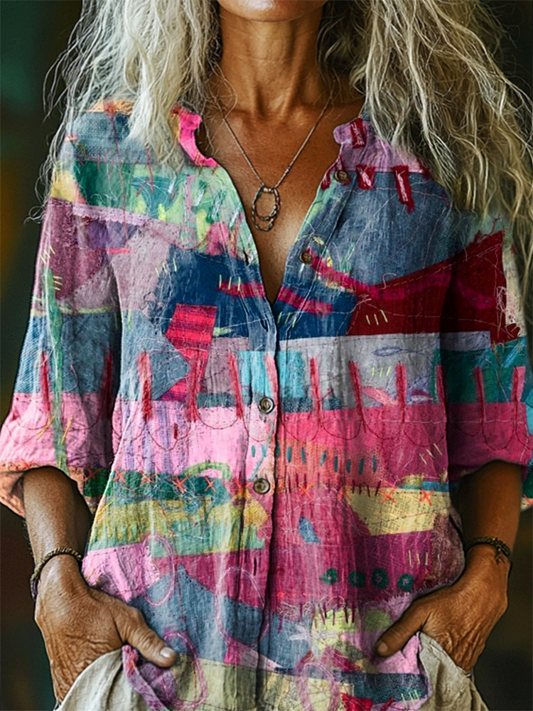Women's Patchwork Pattern Art Print Casual Cotton Pocket Shirt
