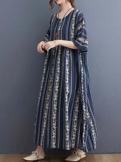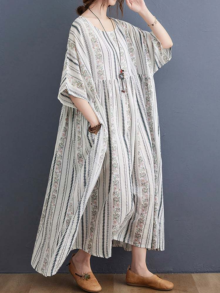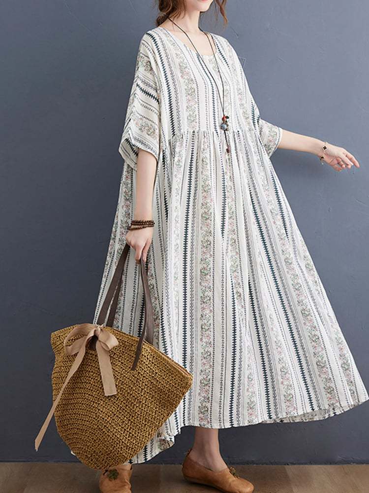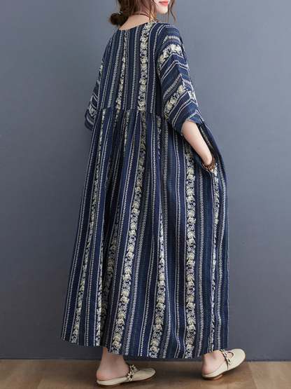 Women's Printed Swing Stripe Midi Short Sleeve Dresses