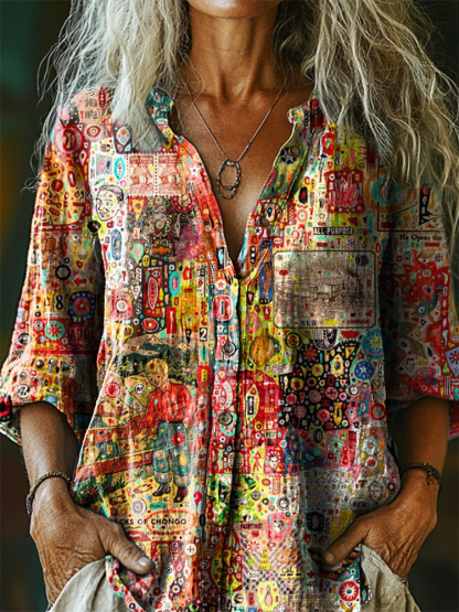 Women's Retro Abstraction Art Print Casual Cotton Linen Shirt