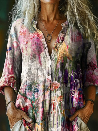 Women's Retro Abstraction Floral Art Print Casual Cotton Linen Shirt