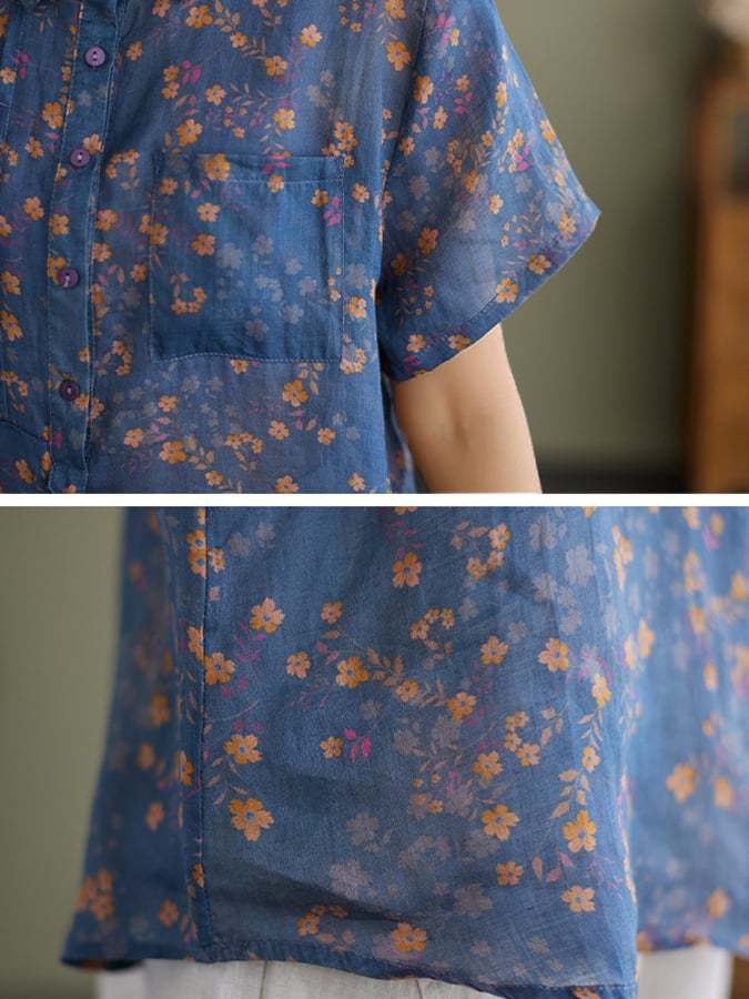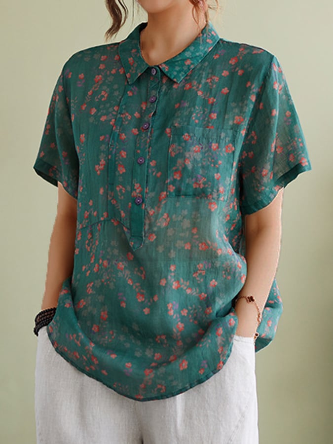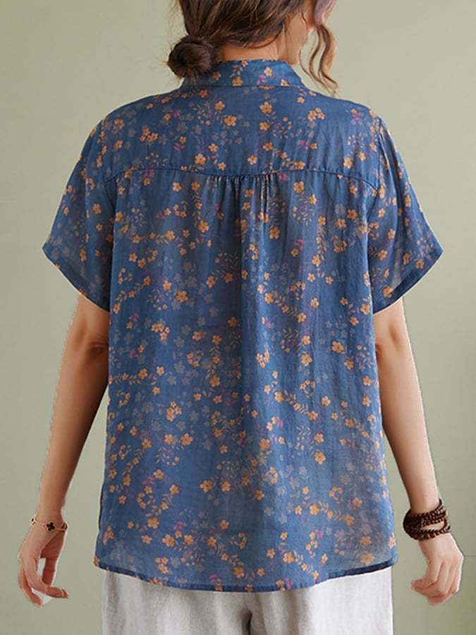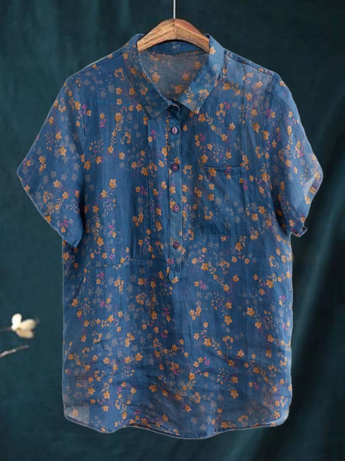 Women's Retro Artistic Floral Lapel Short-Sleeved Casual Cotton And Linen Shirt