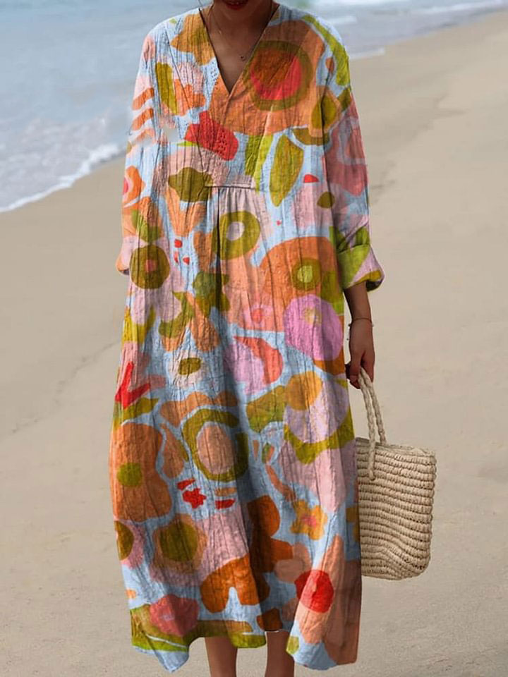 Women's Retro Colorful Floral Art Print Flowy Dress