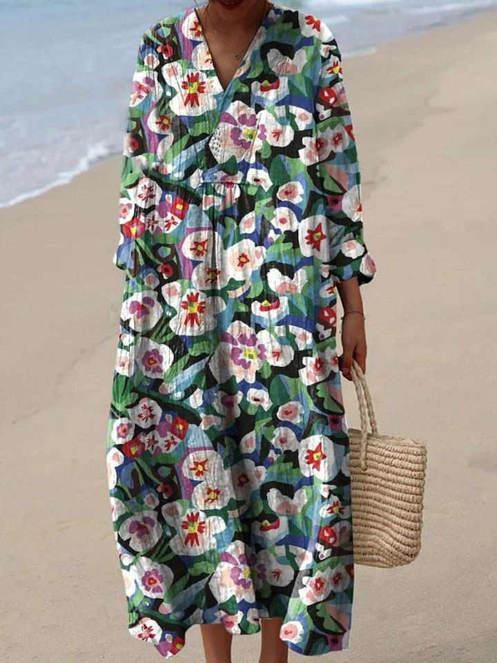 Women's Retro Colorful Floral Art Print Flowy Dress