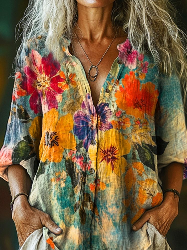 Women's Retro Colorful Gradient Floral Print Casual Cotton Linen Shirt