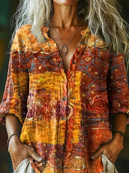 Women's Retro Ethnic Collage Art Print Casual Cotton Linen Shirt