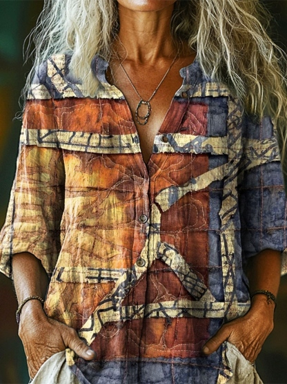 Women's Retro Ethnic Collage Art Print Casual Cotton Linen Shirt