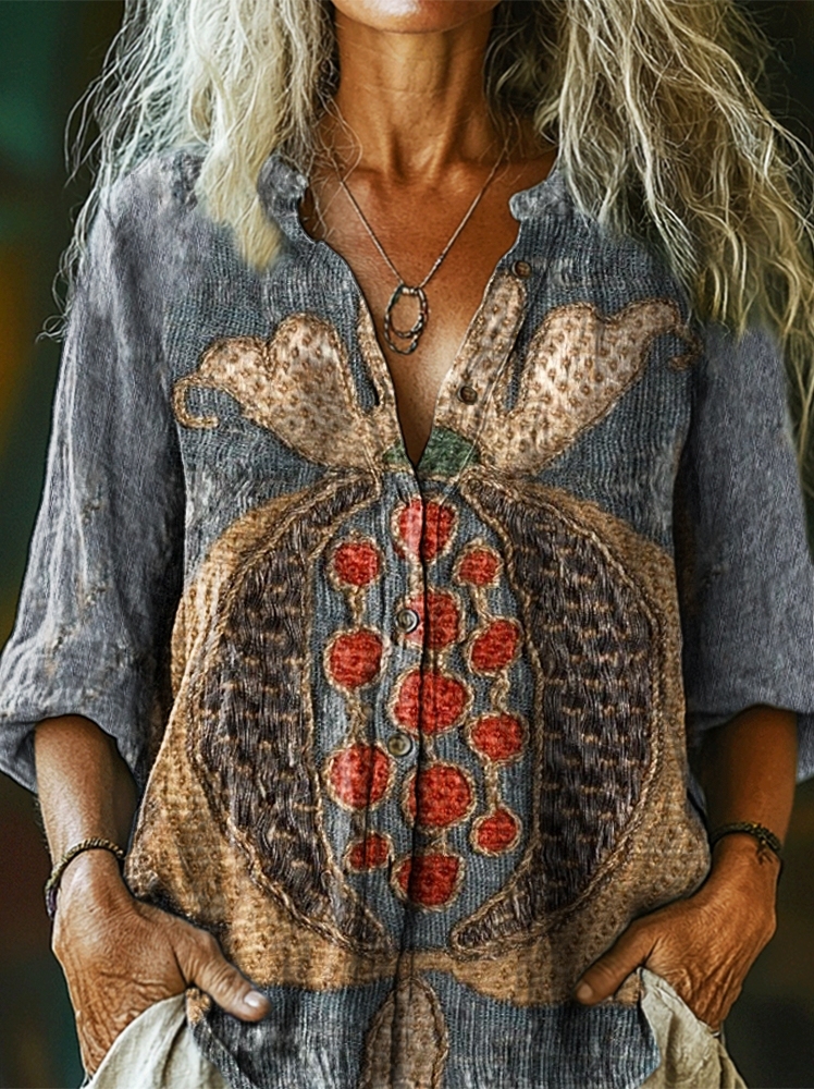 Women's Retro Ethnic Collage Art Print Casual Cotton Linen Shirt